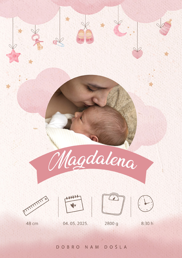 U okvire se mogu dodati personalizirani podaci poput imena djeteta, datuma i vremena rođenja, visine i težine, čime svaki okvir postaje jedinstvena i posebna uspomena na prve trenutke života.